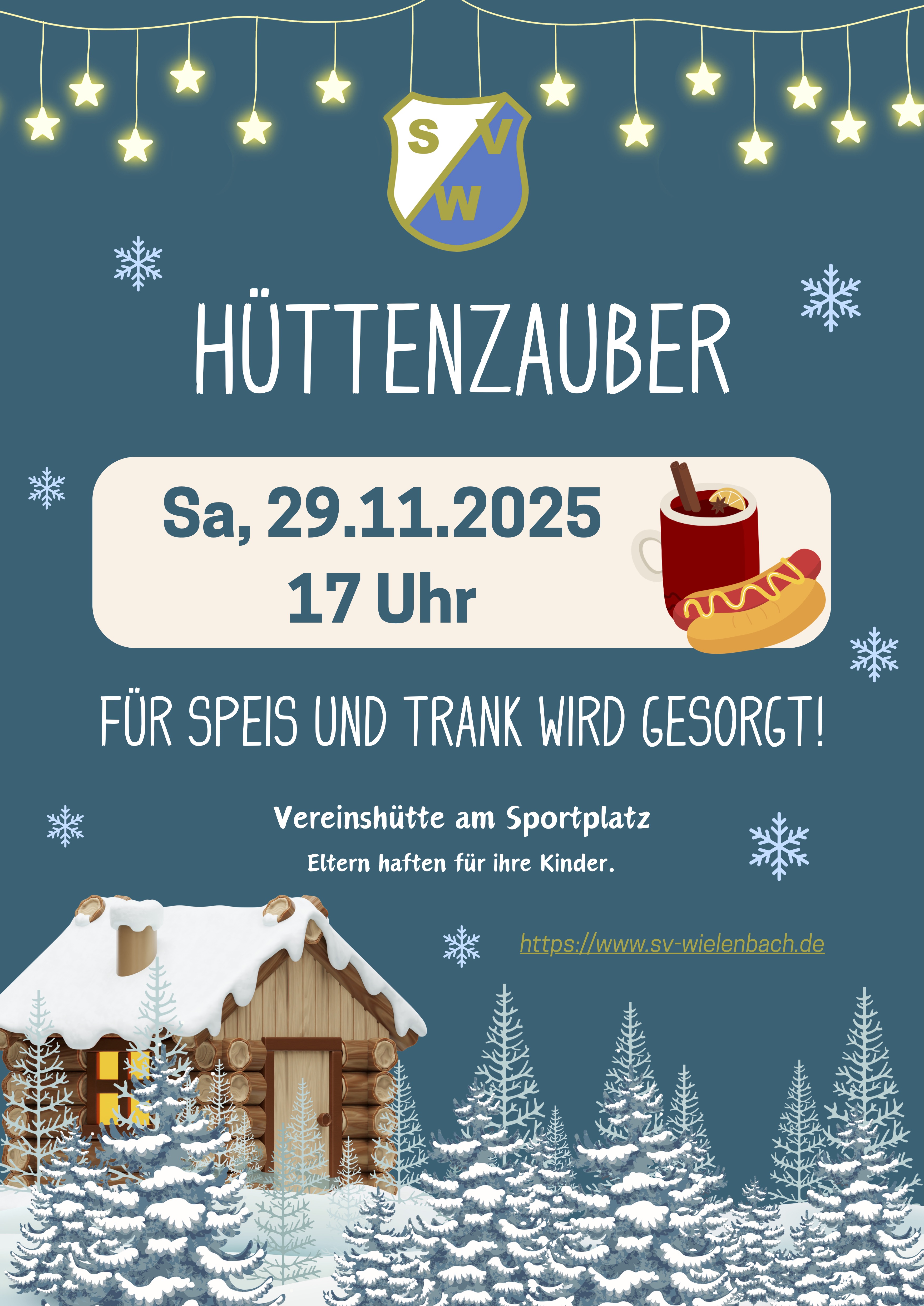 Am Samstag, 29. November 2025 laden wir zum Hüttenzauber in die Vereinshütte am Sportplatz ein.